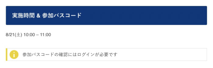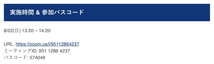 4.イベント詳細ページ内にある「実施時間 & 参加パスコード」からZoomのURL、ミーティングID、パスコードを確認します。